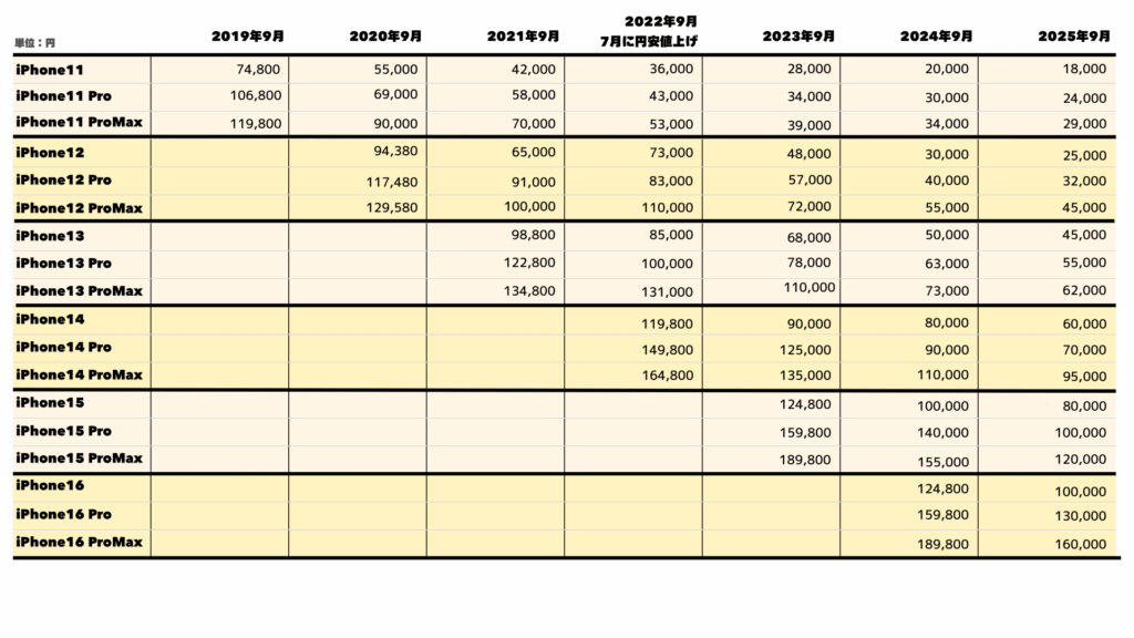 OSアップデートが提供されているiPhone11からiPhone16までの各シリーズの中古価格の推移の目安です。