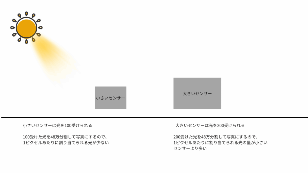 結構ややこしいんですが、画素数が上がるだけでは写真は綺麗になりません。画素数が増えると1画素あたりの光の割当量が減る影響でノイズ発生しやすくなったりするんですね。そこでセンサーサイズも大きくして光を取り込む量を増やす必要があると。