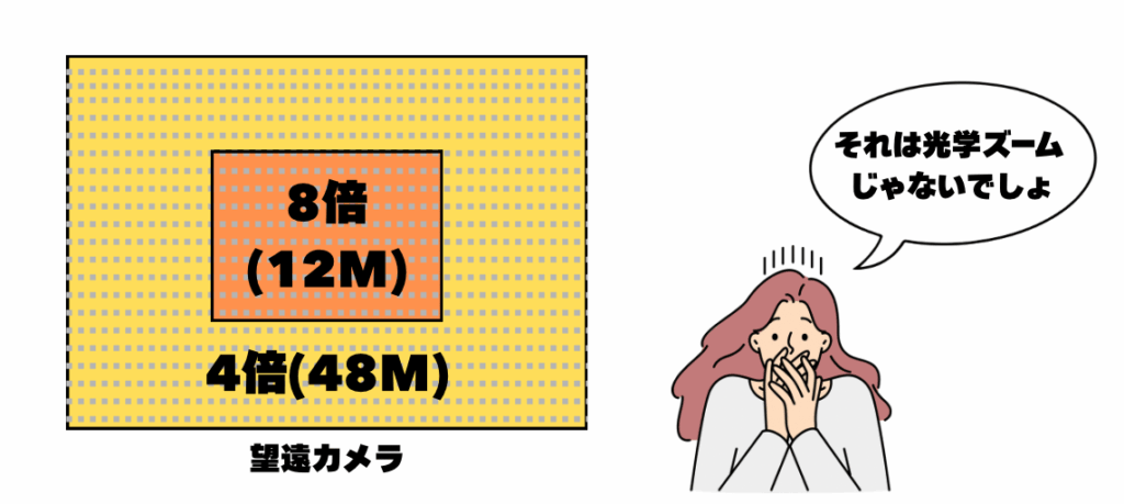わかってはいるんですよ、48MPにしたのは4倍の画質を上げるためでは無くて、あくまで8倍望遠をそれっぽく見せるためです。クロップした状態で12MPを保つための48MPです。
